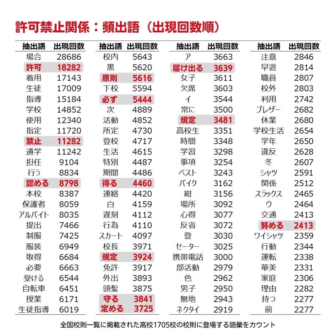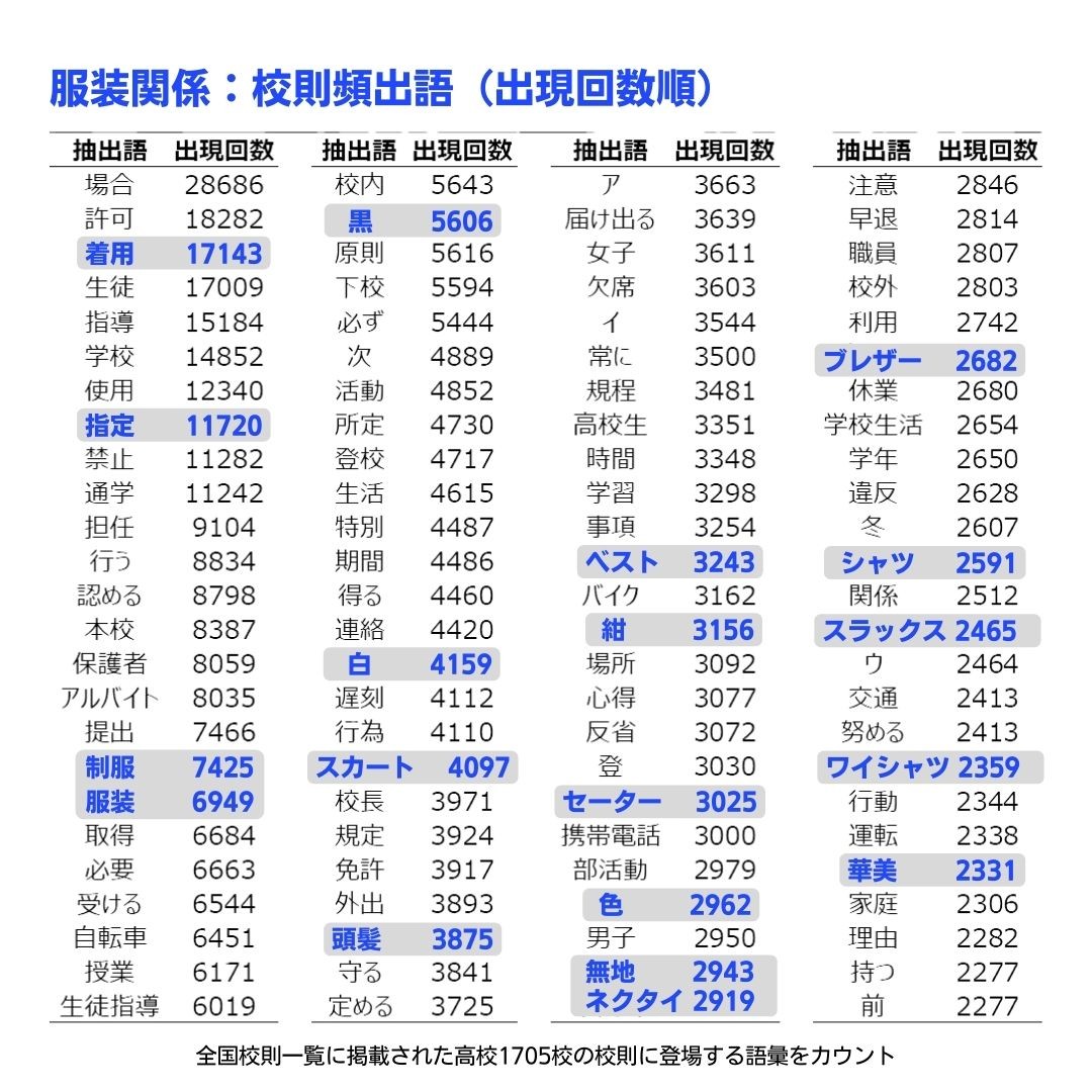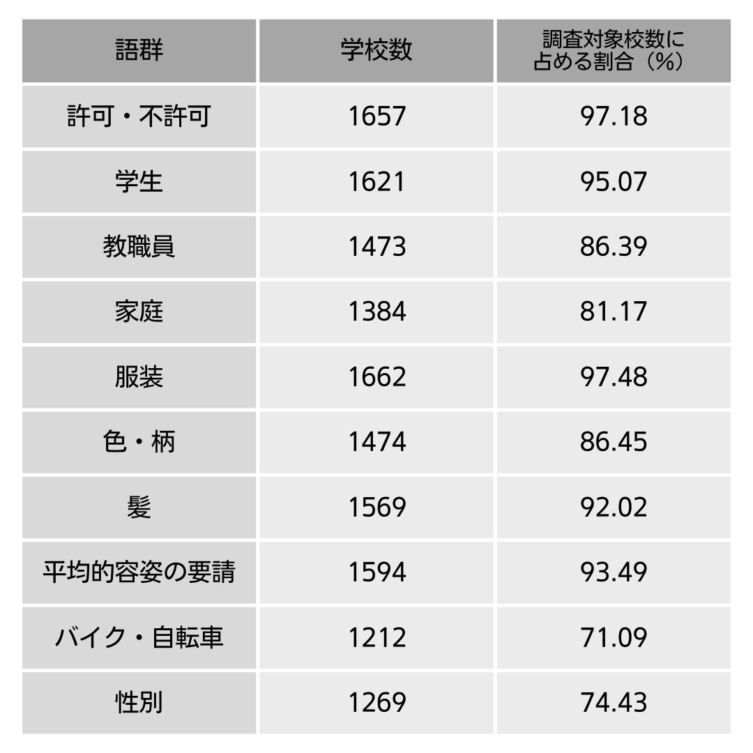 このことから、概ねの校則は、生徒に対して、「清潔」」「清楚」「品位」「地味」を求め、「見苦しさ」「奇抜」「華美」「派手」を規制していることなどがみて取れます。