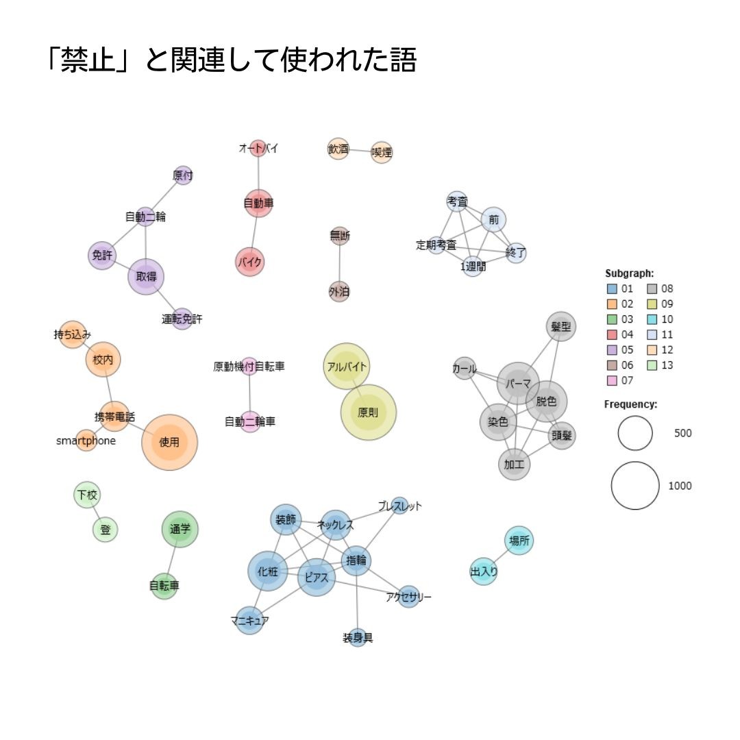 校則は何を禁止しているのでしょうか?「禁止」という語と一緒に使われやすい語を確認したところ、よくある傾向として、次のようなものが見て取れました。