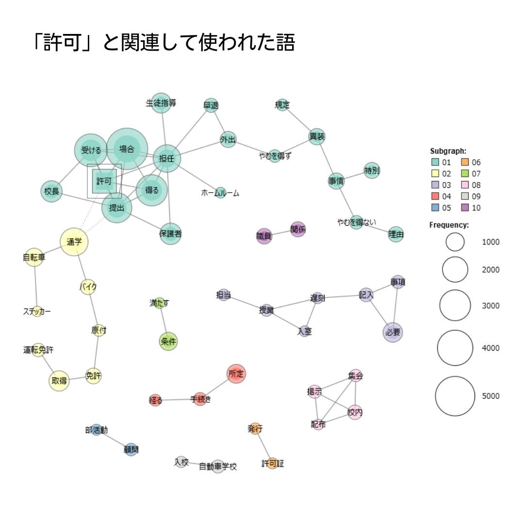 線で結ばれた単語は一緒に使われた(共起した)語であり、円の大きさが単語の出現頻度を表しています。そして円の色の違いは、特に強い共起関係の語同士を機械的にグループ化したものであり、特によく現れた論点を考える参考になります。