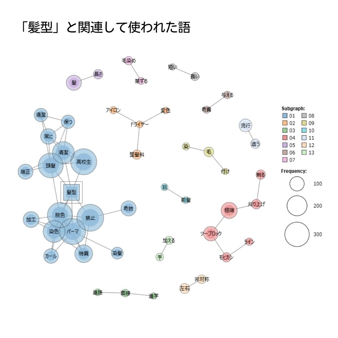 校則の中でよく言及されているのが、「服装」「髪型」「容姿」でした。ここでは、どのような単語が一緒に使用されているかを視覚的に表す共起ネットワークという手法を行い、「髪型」というワードとともに言及されている単語を抽出して分析しています。