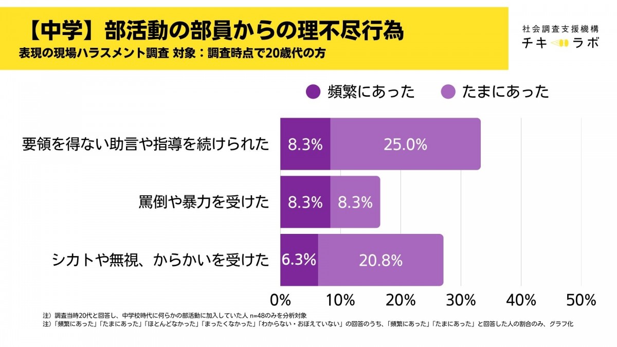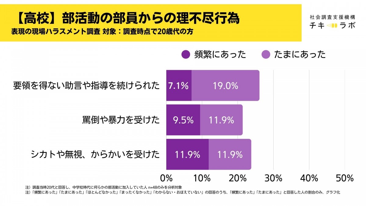 調査にご協力いただいた、当時20代の方の回答を見ると、中学校時代、高校時代の部活動において、調査した以下の項目いずれでも、経験したことがある状況となっていました。