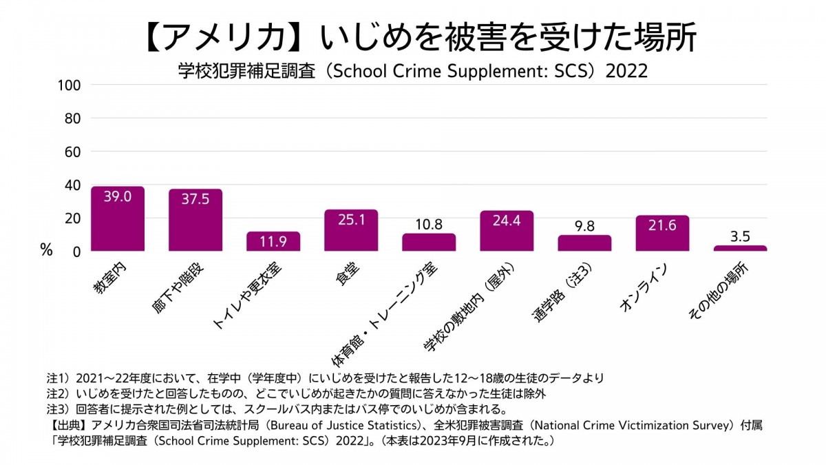 アメリカの司法省による「全米犯罪被害調査(the National Crime Victimization Survey)」では学校での犯罪として、いじめ(bullying)を調査しています。その調査では、「教室」「廊下」「トイレや更衣室」「食堂」「校庭」「通学路」など複数の場面をあらかじめ列挙し、調査対象者に回答させる形で「場所別発生率」を出しています。