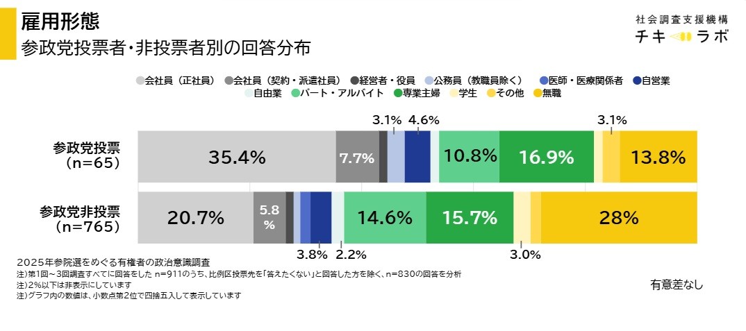 雇用状況については、統計的に有意差は確認できませんでしたが、参政党投票者が不安定な雇用に置かれていると言うこともできません。