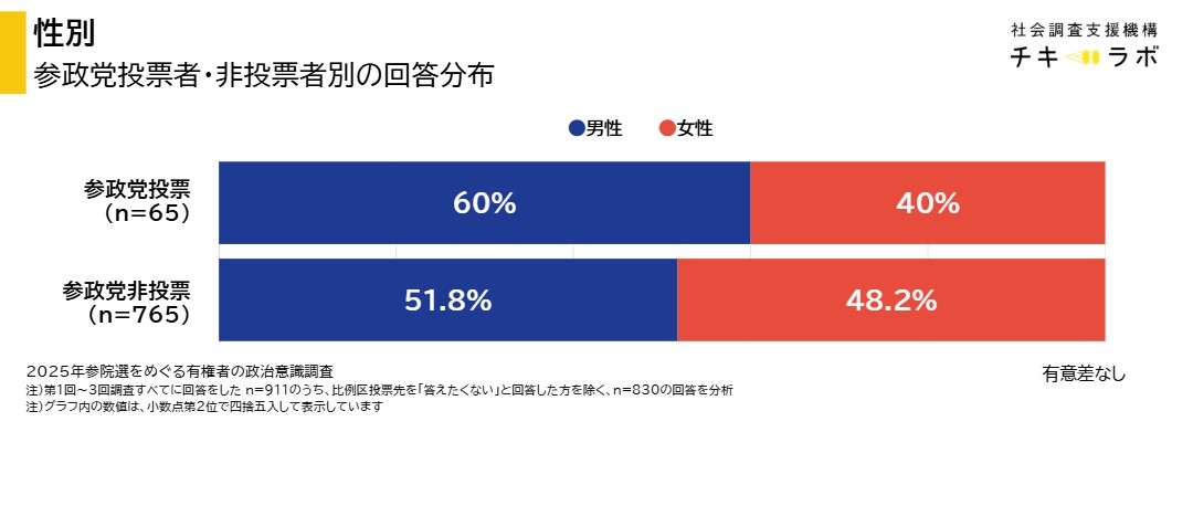 なお、参政党投票者の年齢構成は非投票者と比べて40代が若干多く、70代以上が少なくなっていますが、統計的に有意差があるとは言えない結果です。性別は若干男性が多いように見えますが、こちらも統計的有意差があるとはいえませんでした。