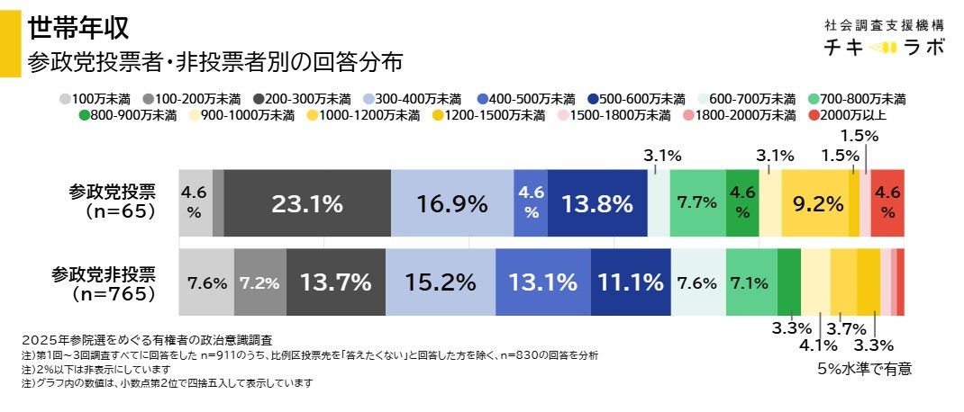 しかしチキラボデータからみえる結論は、参政党に投票しなかった人と比べて、「参政党投票者の方が、経済的に不安定な状況の人が多い」とは言えない、ということです。むしろ今回の調査に回答した参政党投票者は、相対的に安定した層に属する方が多い結果となっています。