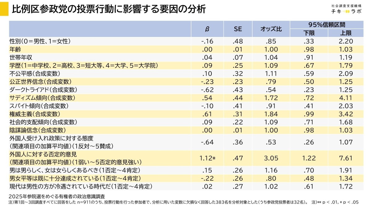 以下の表は、参院選の比例区で参政党に投票した人を「1」、それ以外の人を「0」とした「ダミー変数」と呼ばれるものに対して、どのような要因が影響するかを分析する二項ロジスティック回帰分析の結果です。「β」と表記がある列に*がついている要因が、影響がある要因です。