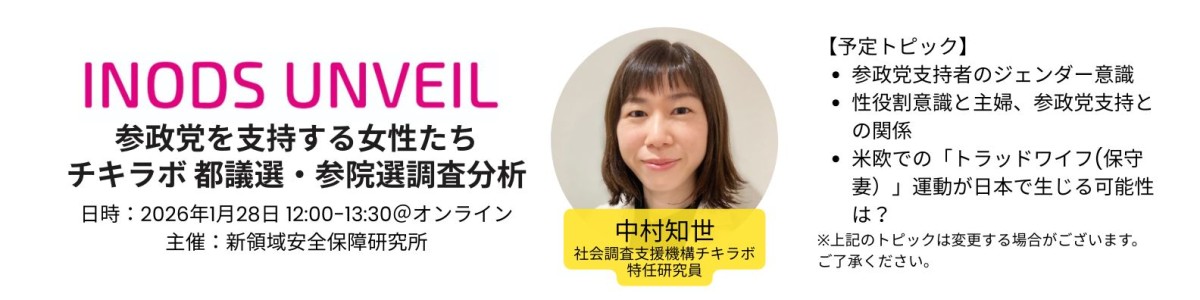 本記事に関連し、経済安全保障やデジタル影響工作など、新たな安全保障分野をテーマに情報収集・調査研究・発信を行う新領域安全保障研究所 INODS UNVEILのtheLetterにて、「男は男らしく、女は女らしく」「子育てについては男性は女性にかなわない」など性別役割観に関わる認識をどのくらいの人が支持しているのか、ジェンダーに関わる人々の意識を分析したレポートを気候しています。有権者の「反フェミニズム認識」を参政党支持との関係から探ります。こちらもぜひご覧ください。