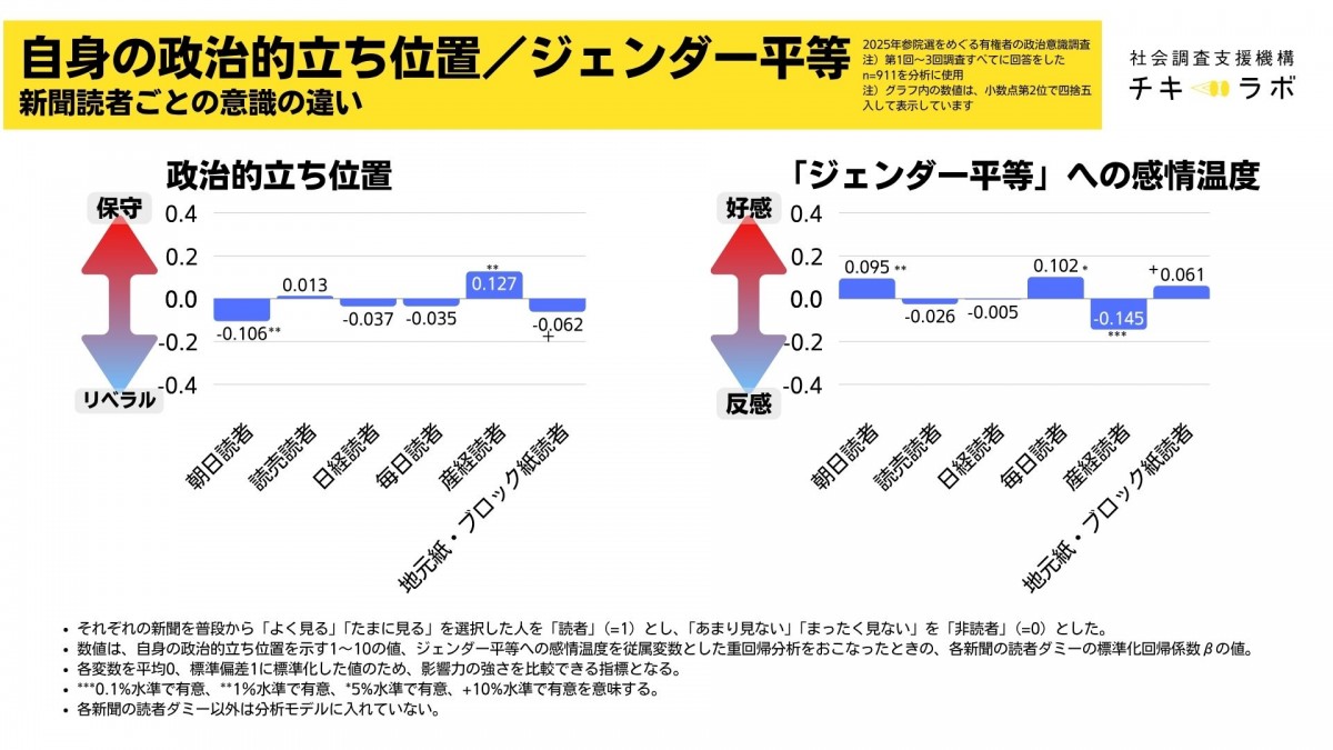 朝日はリベラル・ジェンダー平等に好感、産経は保守・日本人ファーストに好感と外国人脅威意識が強い傾向