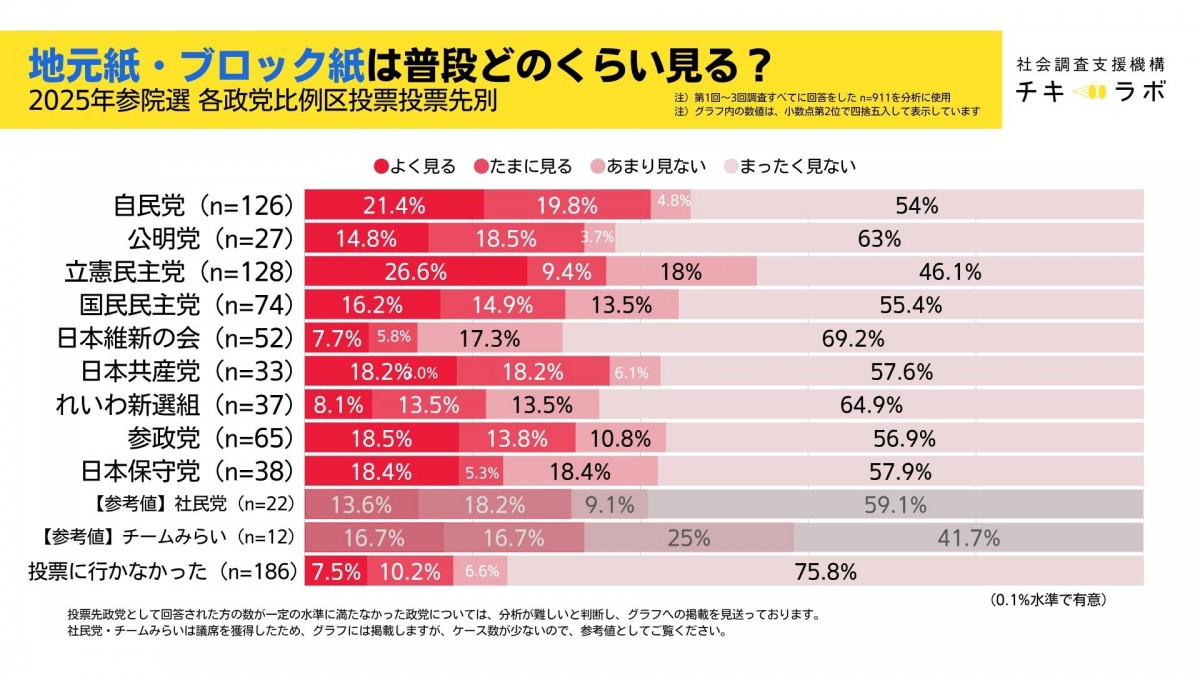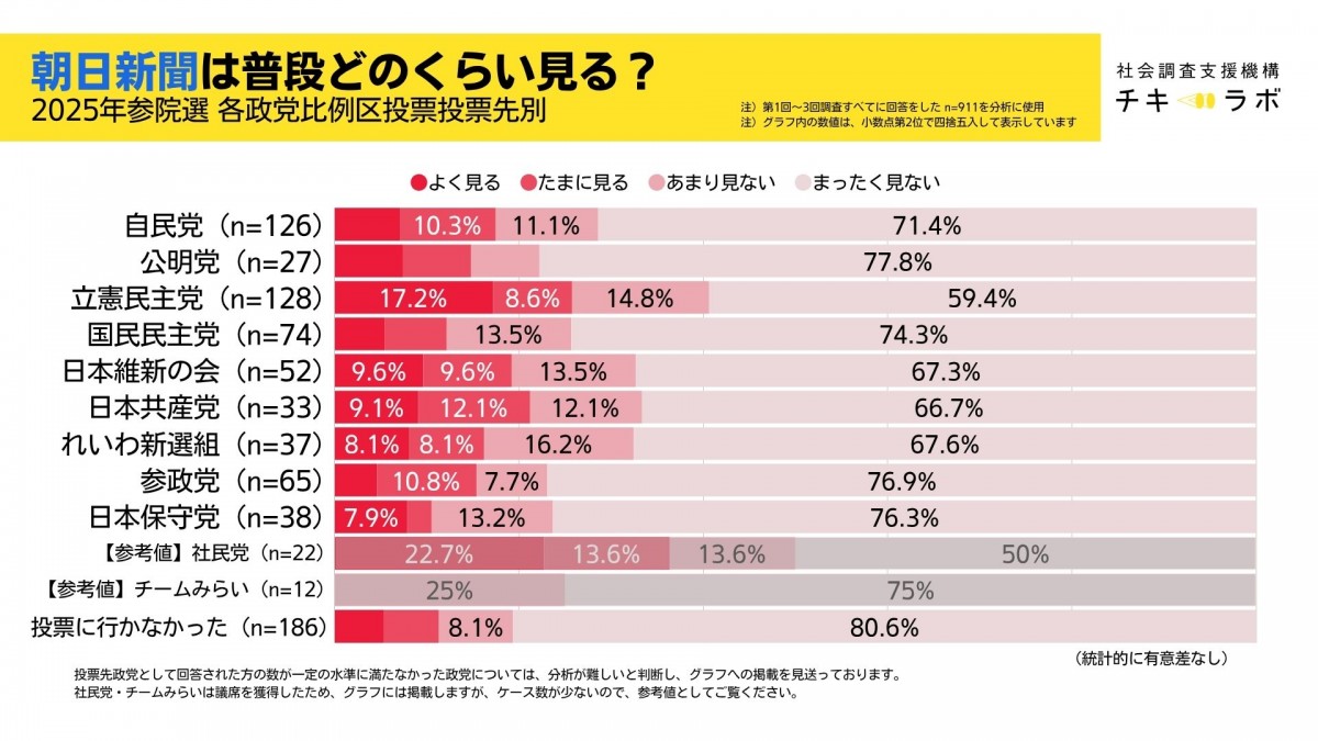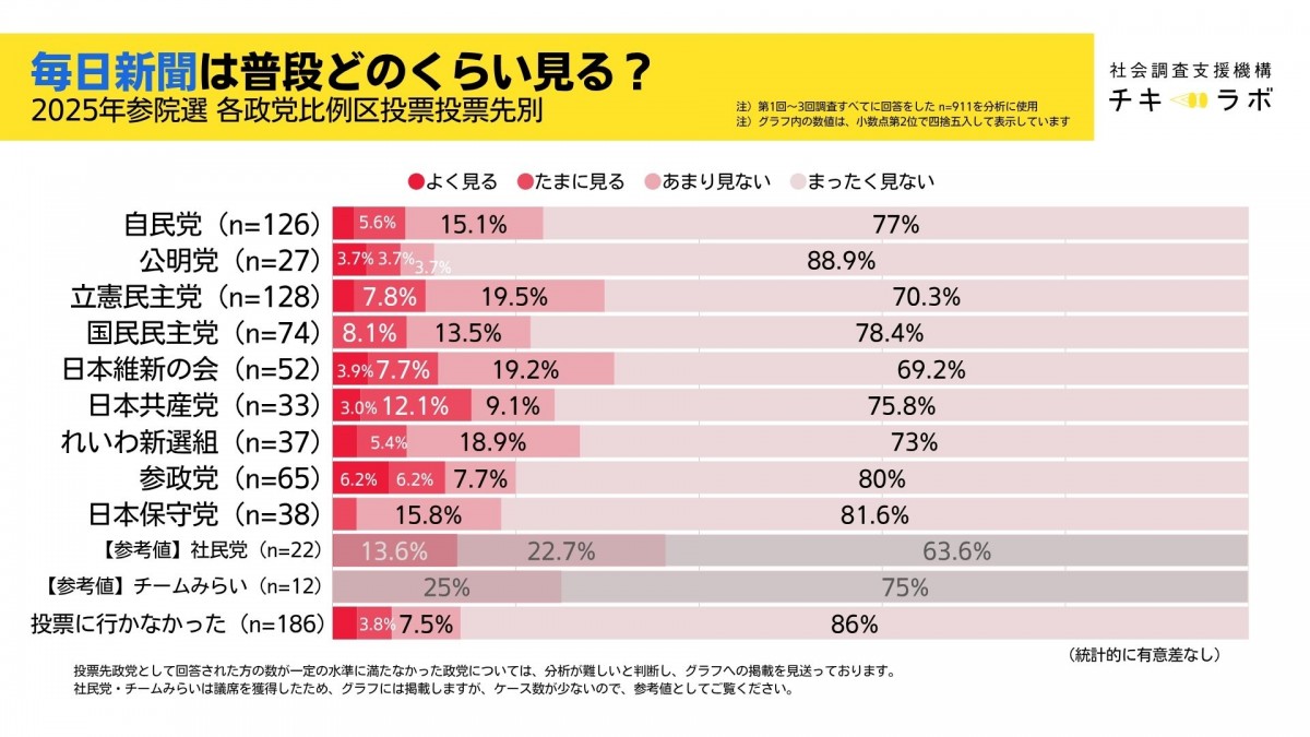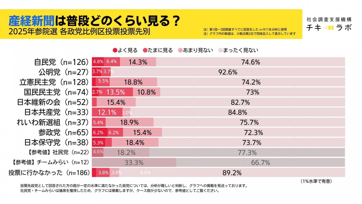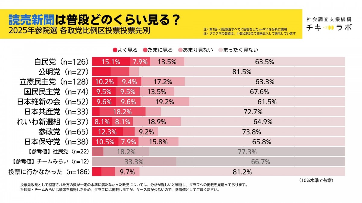 読売新聞:どの政党支持者でもおおむね同じ水準。自民と参政党の「よく見る」の比率がやや多い傾向も
