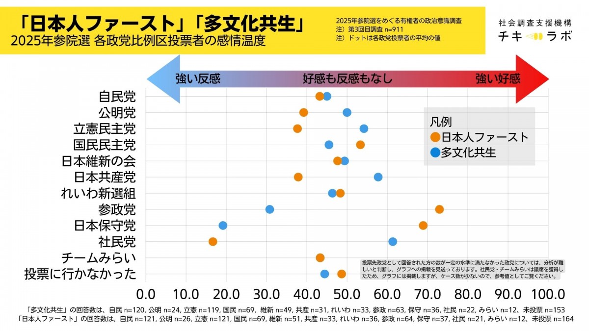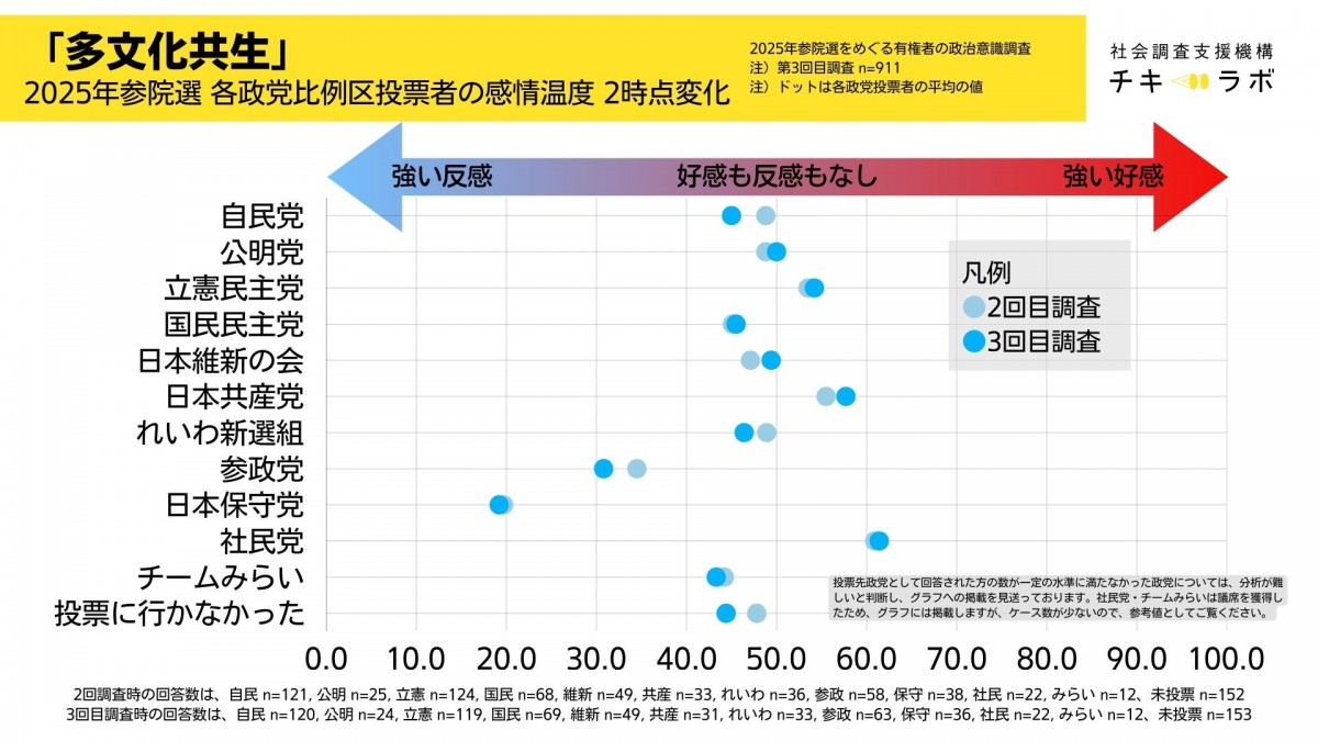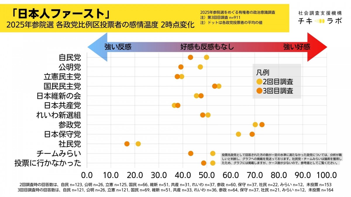 参政党投票者は、第2回目時点ですでに70度付近と高い好感度となっていましたが、選挙戦終盤までこの好感度を維持していた様子もわかります。このフレーズ自体への批判もメディアでは続いていましたが、参政党支持者が「日本人ファースト」への好感度を下げることはありませんでした。