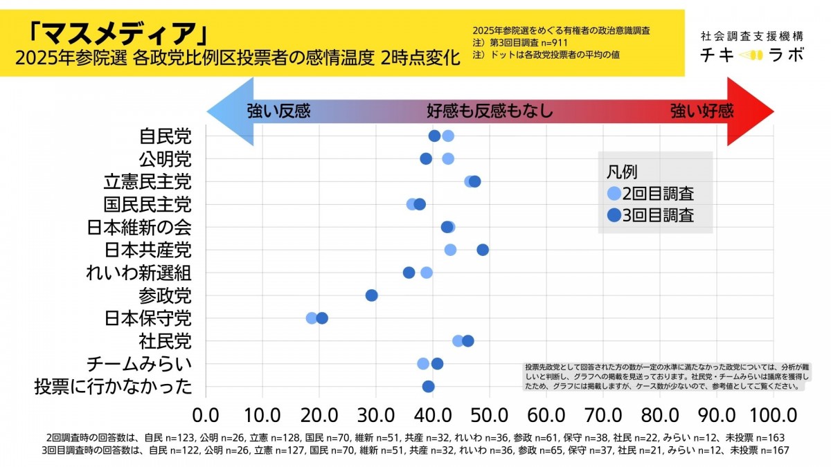 「マスメディア」への好感度はどうでしょうか。こちらも全体平均だけ見れば大きな変化はなく38.8度から38.5度となっていました。投票先の政党別に見ても、変化は大きくないように見えます。共産党投票者ではやや好感傾向に傾いている様子がうかがわれます。