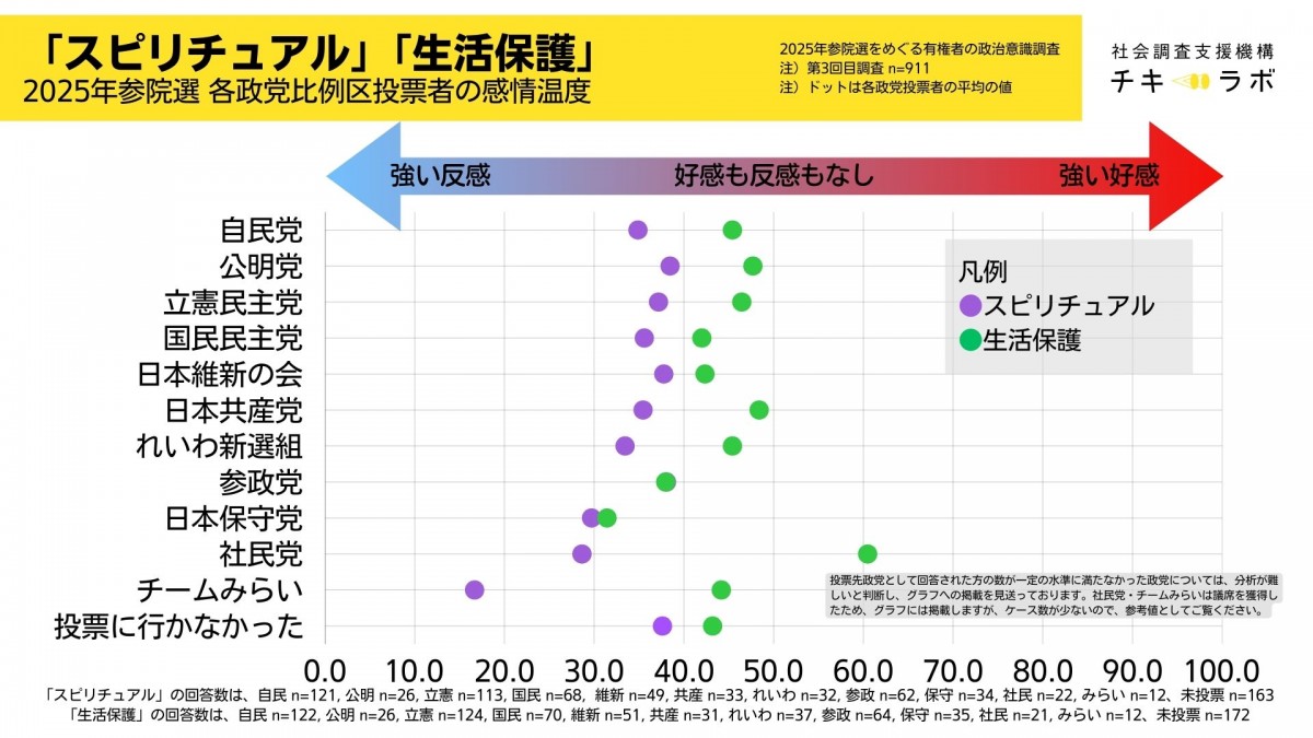 他にも第3回目調査では、「スピリチュアル」「生活保護」への好感度も調べました。スピリチュアルについては政党別に大きな違いはないようです。しかし、生活保護については日本保守党投票者でもっとも反感が強く、日本共産党で反感はない、といった違いが見えています。しかし、ここまで取り上げてきたワードと比べると、政党別の好感度の差はそう大きくはありません。
