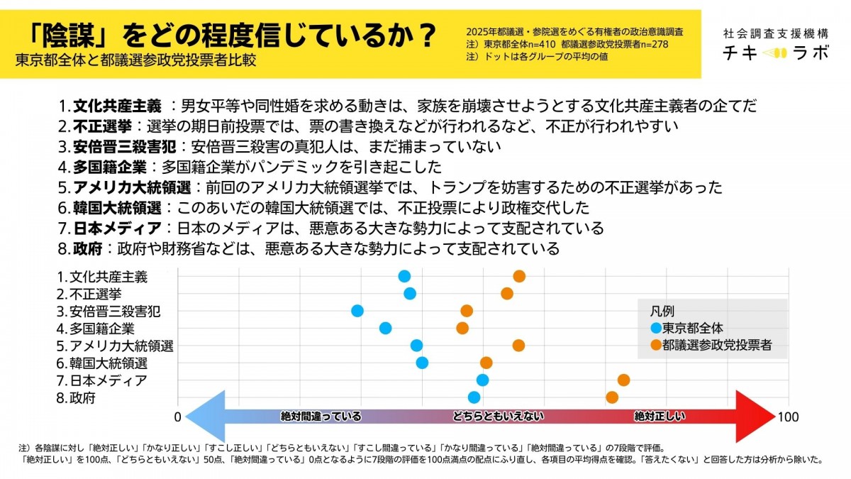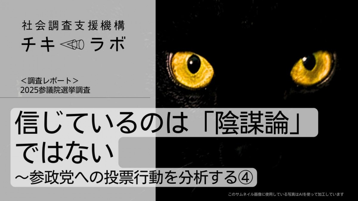 チキラボでは、東京都議選の直後から参院選終了後まで、2025年都議選・参院選をめぐる有権者の政治意識調査を実施。この記事では、参政党支持者の陰謀論への親和性を分析していきます。