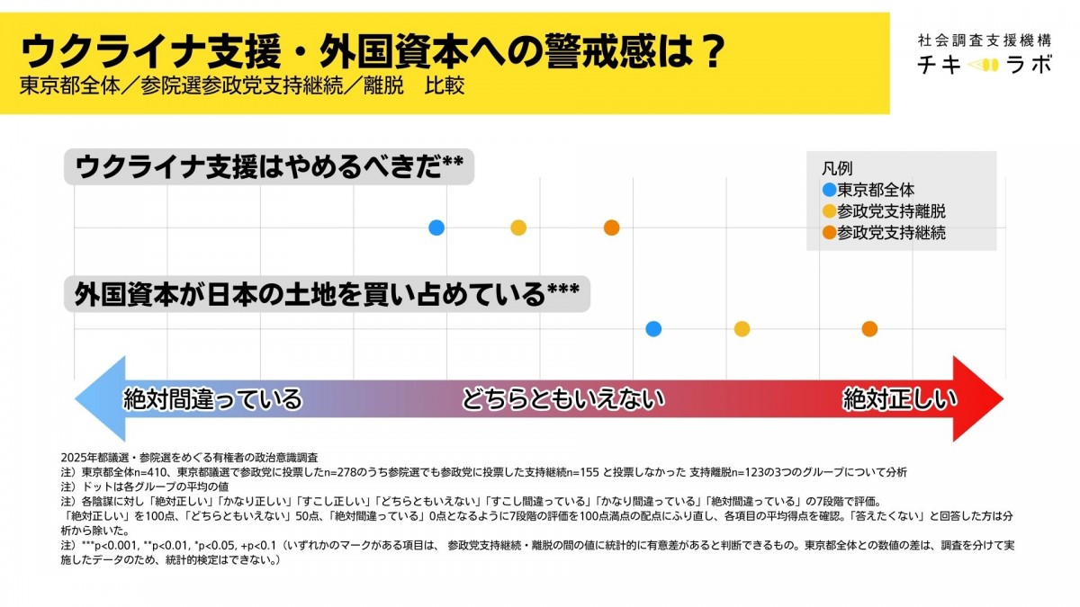 ロシアによる侵攻開始当初と比べ意見が別れるようになったウクライナ支援の正当性、そして近年警戒感が高まっている外国資本による日本の土地購入の問題に対する立場についても調査しています。同じく「絶対間違っている」から「絶対正しい」までの7段階で評価してもらったところ、参院選でも参政党に投票し続けたグループが、いずれの項目でも信じる度合いが最も高いことがわかります。これら2つの項目は部分的に正しい面もありますが、往々にして間違った情報に基づくことがあるにもかかわらず、参政党支持者の極端な姿勢が見えてきます。