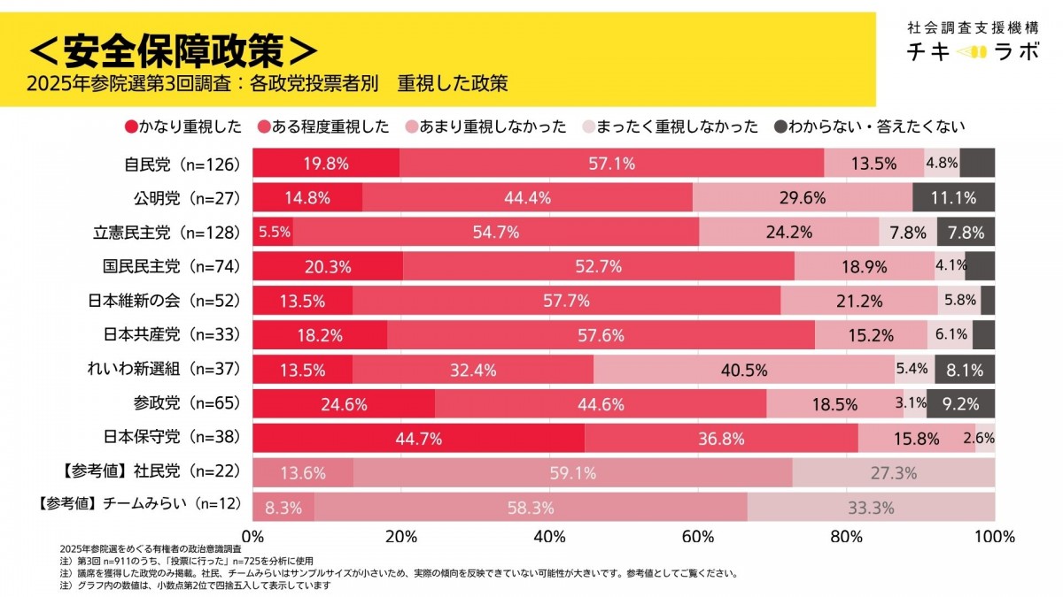 自民党の総裁選後、公明党の斉藤党首は高市総裁に対し、懸念点の1つとして「外国人に不寛容な政策」の改善を示したと報道されています。実際、支持者の重視度を見ても、自民党支持者と公明党支持者で態度が大きく異なっていました。参院選期間中に、自民党が外国人政策を硬化させた動きは、公明党支持者を置き去りにした可能性がうかがわれます。